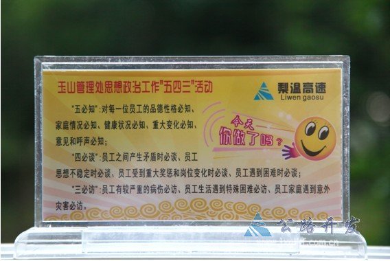 “今天,你做到了吗?”,在梨温高速玉山管理处,收费站站级干部的办公桌上,都有这样一个提示牌,反面是“五四三”思想工作法的内容,上面规定了当出现导致员工思想波动的几种情况,作为分管思想工作的干部,应该进行走访、慰问或者交流、谈心。实际上,干部们是要求自己将思想工作做在平时。