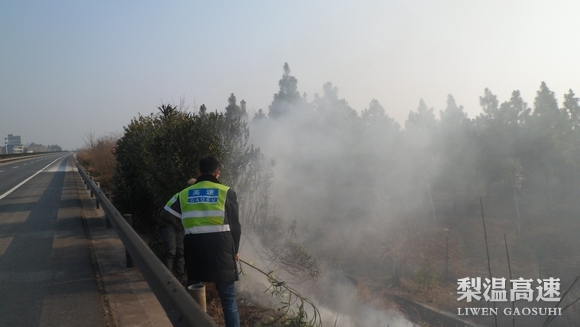 1月17日上午9:00左右,梨温高速玉山养护所巡路员发现K496+800左幅边坡突然冒出滚滚黑烟,过往车辆纷纷减速,绕行,见状他们急忙下车前往查看。