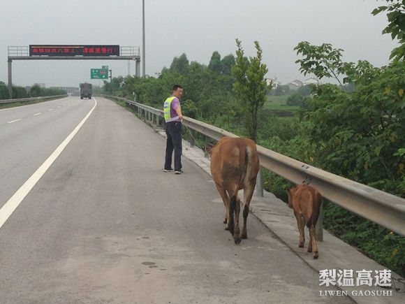 6月25日,东乡养护所外业工作人员在日常巡路过程中,发现有两头走失的牛在高速路上闲走。