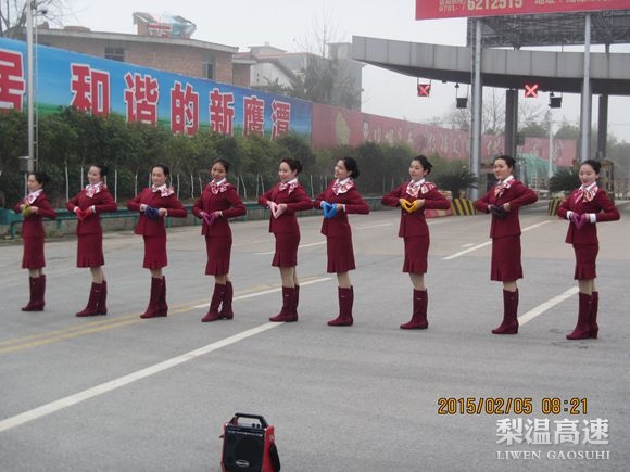 2015年2月5日,春运第二天,江西梨温高速鹰潭西女子收费站开展 “路姐彩虹舞、平安保春运”活动,为春运期间返乡人员排忧解难,送去温馨。这天8时左右,伴随着悦耳的音乐声,一群收费站的姑娘们不约而同集中在收费广场,跳起了自编自导的舞蹈,如七色“彩虹”在江西高速上翩翩起舞,美丽路姐为因浓雾等候在收费站的司乘朋友们呈现一道美丽风景线。姑娘们还为给滞留司乘人员送来姜汤、面条、热开水、导向地图等物,司乘人员说,这样的春运服务暖人心肠。