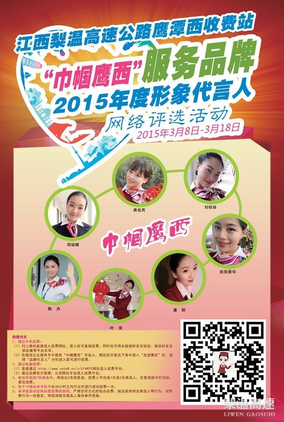 近日,梨温高速鹰潭管理处以网络为平台,面向社会开展“巾帼鹰西”服务品牌2015年度形象代言人网络评选活动。活动分为候选人征集、候选人精选、网络投票评选、选定品牌代言人四个阶段。日前,候选人征集、候选人精选阶段已经结束,2015年3月8日开始进入网络投票阶段。