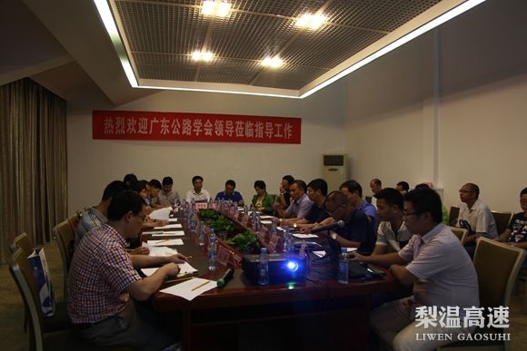 潘皓致欢迎辞,向广东同行介绍了梨温高速管理路面维修项目建设、工程概算投资、技术标准及工程进展等情况。该工程项目设计代表、工程技术处向客人们介绍了设计思路和厂拌冷再生工艺,就冷再生的体会和建议向客人做了汇报。