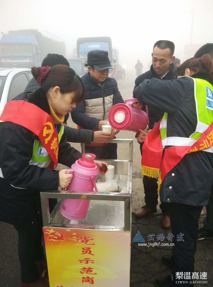 2月5日凌晨,一场大雾笼罩赣鄱大地。接有关部门通知,要求梨温高速进贤站入口实行封闭,随着时间的推移,入口车道聚集的车辆越来越多。为缓解迫切回家的司乘朋友焦急等待的心情,该站党员示范班为寒冷天气下滞留的过往司乘提供暖心服务。