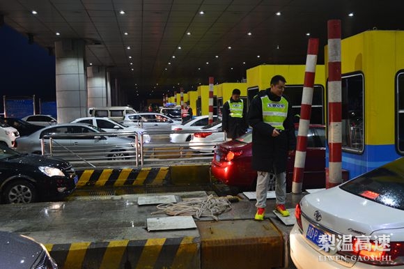 然而,免费时段的结束并没有放缓旅客返程的脚步,滚滚车流伴着深夜突如其来的暴雨席卷而来。为此,该站一是启动了春运保障应急预案,有条不紊、责任到岗、任务到人,收费广场和ETC通道安排专人负责指挥、引导车辆分道通行;二是组织该站全体机关人员,启用了临时收费岗亭和便携式收费机进行复式收费,加快车辆收费速度;三是在每条车道安排一名党员干部,向不了解收费政策的司乘耐心做好解释工作,避免车主因拒不缴费所产生的车辆拥堵;四是邀请高速交警协助疏导交通,杜绝收费广场交通事故,保障行车安全。