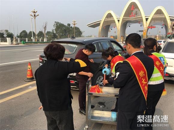 受大雾天气影响,近日玉山收费站接交警通知,入口封道,出口分流,车辆禁止上高速,司机滞留。 图为 “熊文清班组”成员面带微笑,身披“熊文清班组”绶带,手推 “英雄服务车”走进受困人群,亲切的为滞留司乘提供开水、导向服务。(黄灵翔 郑力恺)