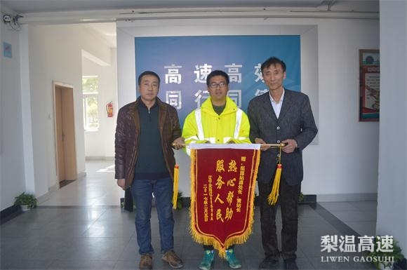 2月14日,两名辽宁籍司机来到梨温高速赣浙界梨园站,向该站员工送来了锦旗,以感谢十天前他们的及时援助。两名司机拉着该站员工的手说:“那天要不是你们及时帮助我们灭火,车辆损失及乘客安危可能无法想象,而且在那么冷的天还给我们送吃的喝的,帮我们解决了难题,向你们再次表示衷心的感谢!”
