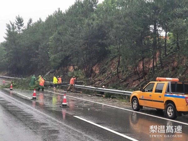 早上6时许,沪昆高速梨温段K578+700左幅往上海方向,因暴雨冲刷导致护坡松动坍塌,部分树木倾倒在高速路上,造成行车道受阻。辖区高速路段管理单位南昌南管理中心迅速组织上饶养护所人员前往现场抢修,抢修人员到达现场立马摆放好安全锥,引导车辆从超车道通行,并开启警示灯,提醒司机缓慢通行,随机用电锯将树木的根部锯断,冒雨将树木抬离高速路面,并将散落的树枝清理干净,经过连续紧张作业,上午10点道路恢复正常通行。