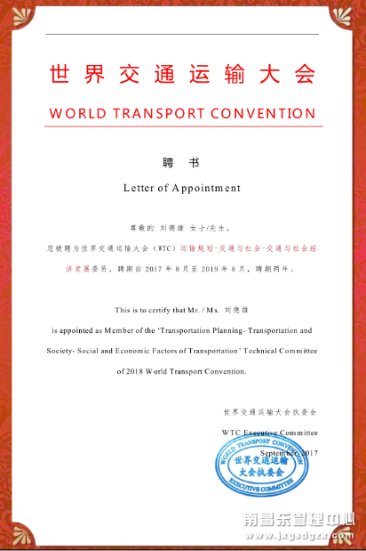6月28日,世界交通运输大会执委会发来聘书,聘用刘德雄同志为“世界交通运输大会(WTC)运输规划—交通与社会—交通与社会经济发展”委员,聘期两年。