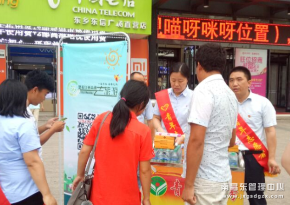 7月11日下午,南昌南管理中心东乡收费所与东乡站的员工身披绶带,分别来到人流量密集的东乡县东乡超市门口和抚州东高铁站,开展沿着江西高速去旅游微信公众号推广活动,现场吸引不少市民前来咨询,现场青年志愿者耐心细致地讲解,并且只要现场扫描关注公众号,即可获得一瓶矿泉水和一份小礼物。