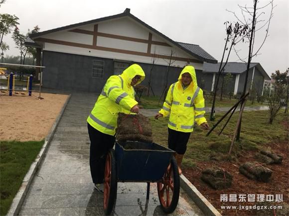 此前,由于前期维修管道设施地面开挖,导致部分草坪枯萎,破坏整体环境美观。在杜市收费所的大力支持下,针对庭院绿化的缺陷,在10月23日及时采购台湾青草皮750平方米,对枯萎草坪进行整体修复。连日来的持续降雨天气,丝毫没有影响铺设进度,值班人员克服天气因素,冒着大雨工作,通过近两天的不懈努力把所有枯萎草坪修复更换完善,保持了站域环境干净整洁使庭院绿化效果较好。