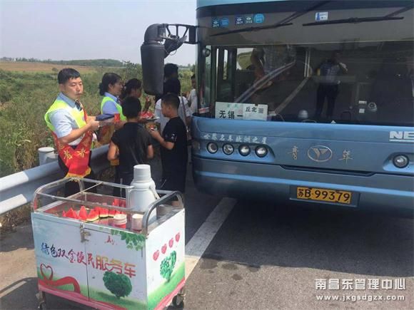 8月22日,南昌南管理中心双金收费站组织职工为滞留在收费广场的乘客送上水果和防暑降温药品