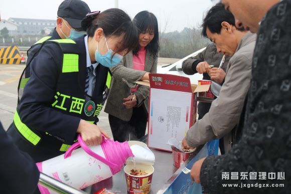 据悉,昨天晚上二十三点四十左右,杜市收费站接交警通知实行临时交通管制,封闭所有入口车道。早上7点多,该站入口已经排起了一条条长龙,有的司机甚至是等了一晚上,有的是拖家带口去云南、浙江、赣州等地务工。为缓解司乘人员的焦急之心,该站值班站长立即在广场设立便民服务台,一边组织青年志愿者为滞留司乘提供开水、泡面、路况咨询,安抚、耐心解答他们的问询,一边安排专人对车辆进行解释工作,缓解司乘人员焦躁情绪,同时疏导等待车辆停靠有序,确保道路开通后车辆快速安全通过。志愿者们的暖心服务得到了司乘的赞许,他们也用手机拍下了这一幕幕感动瞬间。