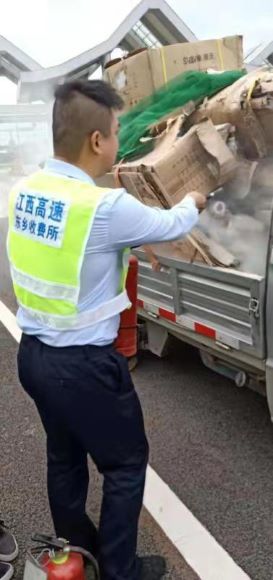10月11日,一辆微型货车在南昌南管理中心进贤收费站出口发生货物起火事故,在该收费站工作人员的相助下,及时进行了灭火,避免了一起火灾事故的发生。