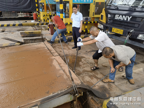 故障情况清晰,维护站人员迅速制定抢修方案,他们立即将地磅的电路关闭,以免因漏电发生安全事故。他们一边与收费站沟通启用应急预案,将受损车道关闭,及时疏导现场车辆。一边与地磅厂家售后联系,请他们立即派人前来检修地磅。在等待的同时,大家又一起清理收费广场和地磅积水,为能够快速抢修创造有利环境。