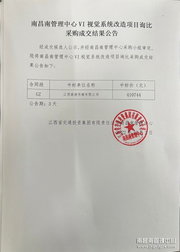 上一篇:南昌南管理中心2022年第二批备品备件采购询比结果公示 下一篇:2022年车道升级改造工程施工项目(结果公示)