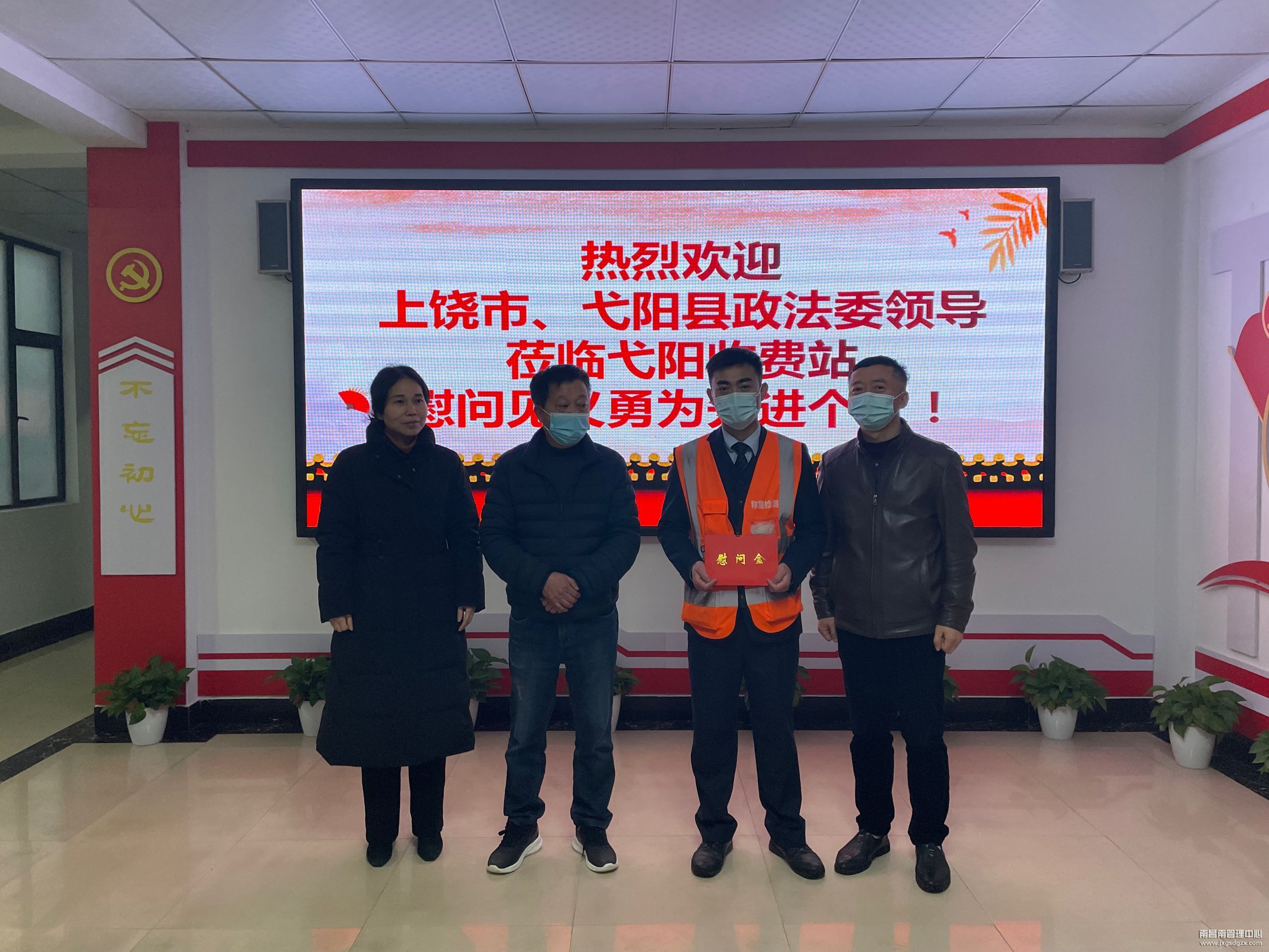 在春节来临之际,弋阳县政法委为关心关爱见义勇为人员,进一步弘扬见义勇为精神,特前往南昌南管理中心弋阳收费站表彰慰问“灭火英雄”吴志华。