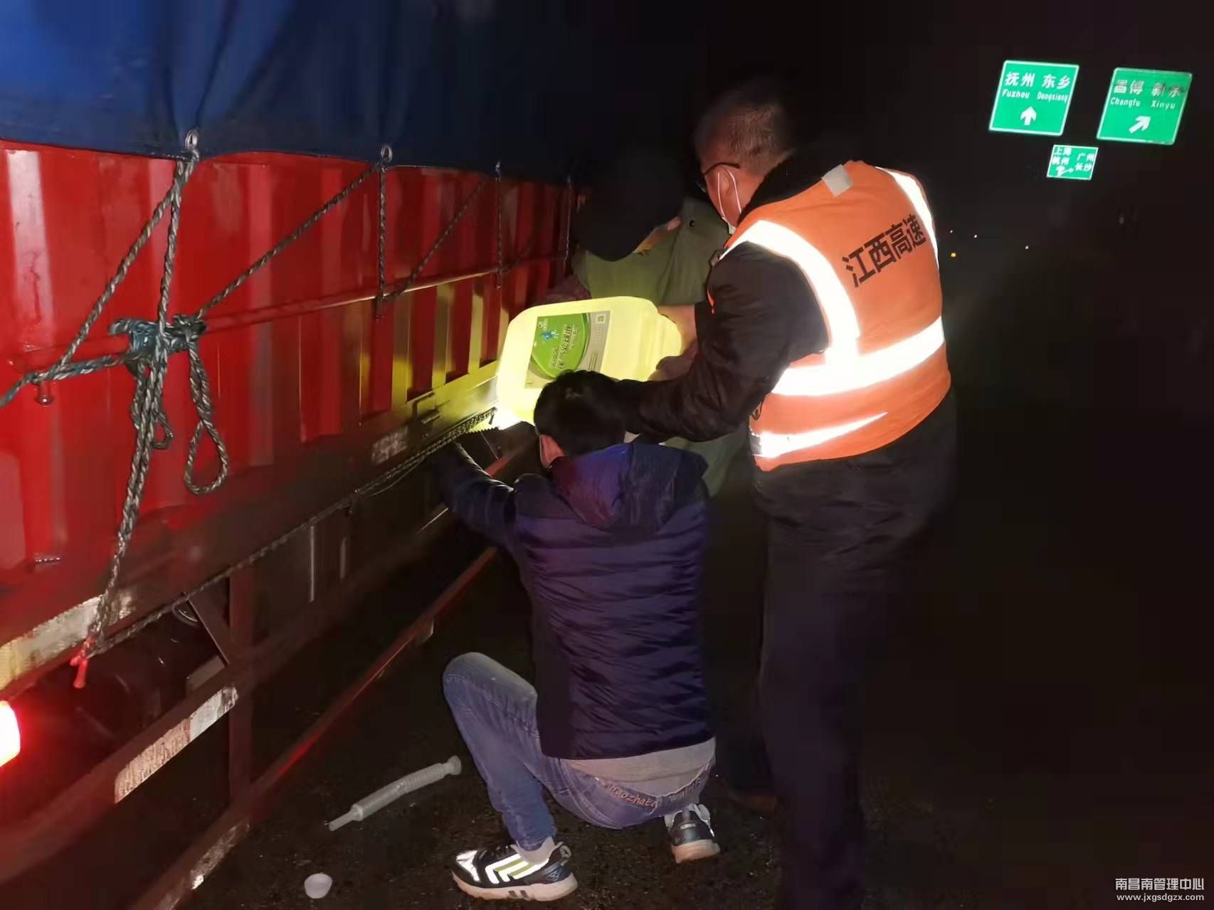 1月28日,一辆车牌为赣CGWxx红色小车燃油耗尽停滞不前,幸好南昌南管理中心桥东收费站员工热心帮助解其燃眉之急,帮助车主重新踏上了回家之路。