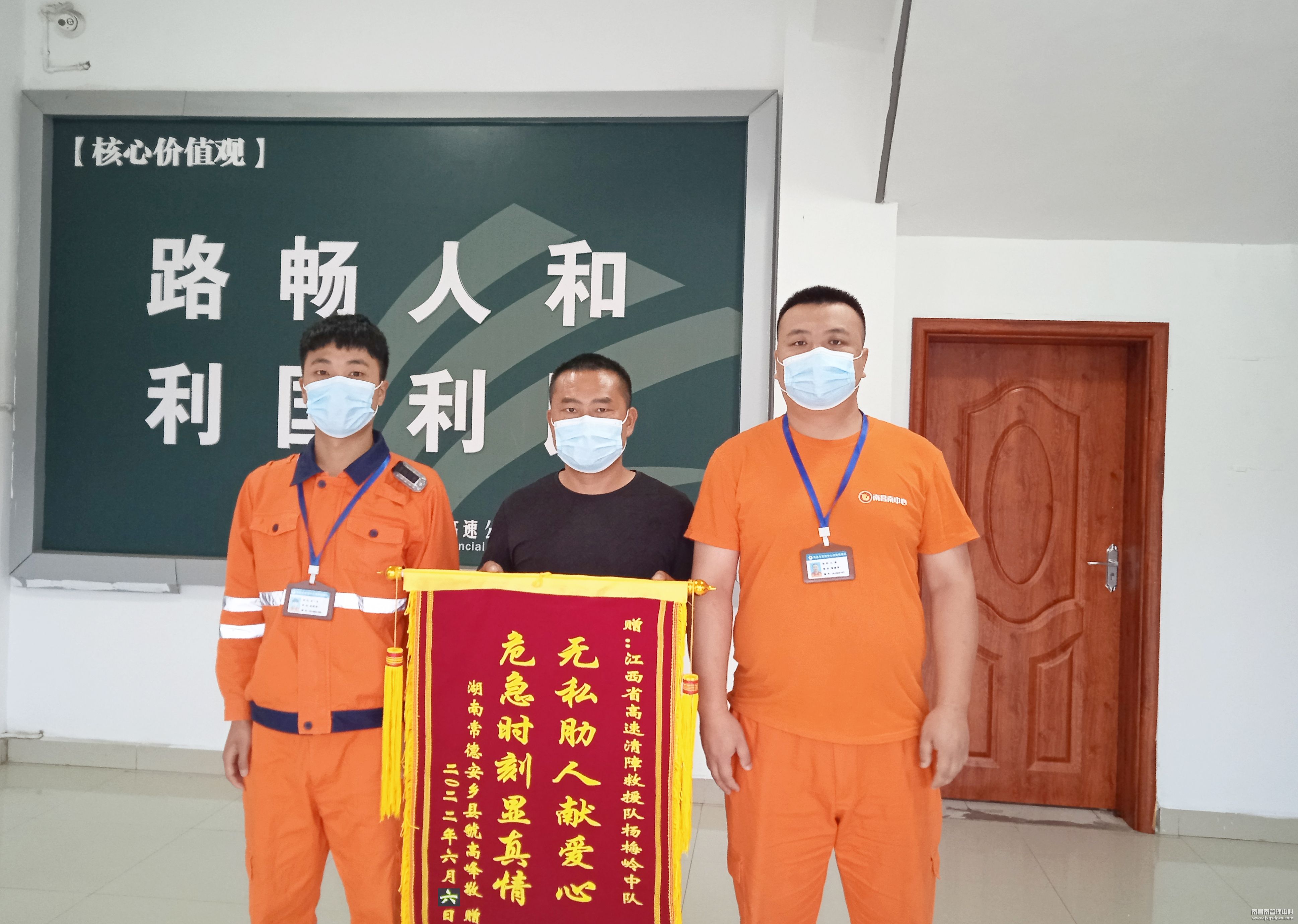 6月6日上午10点,湖南省常德安乡县虢先生将一面印有“无私助人献爱心,危急时刻显真情”的锦旗送到南昌南管理中心车辆救援大队杨梅岭中队,用最质朴、最真挚的方式表达对杨梅岭中队队员热情、暖心服务的感谢。
