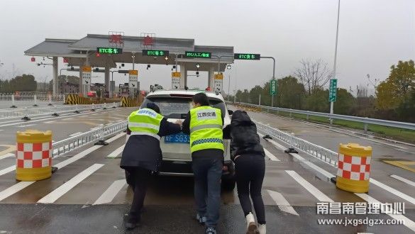 2月8日上午9点, 一场大雨突如其来,南昌南管理中心双金站当班人员像往常一样在车道巡视,发现一辆小车停留在收费匝道处,立即上前询问情况。