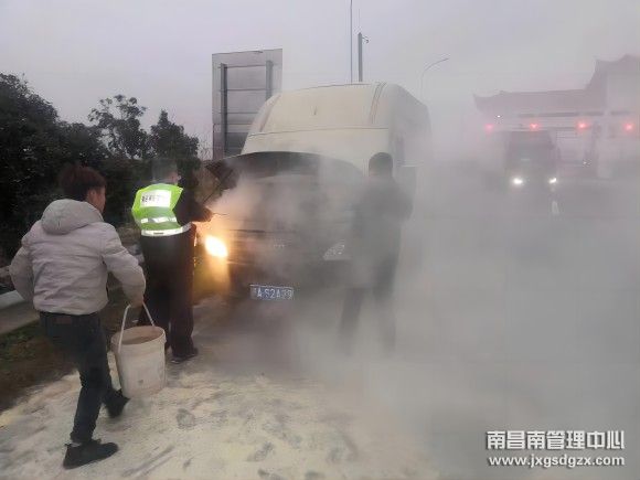 当天下午17时27分,一辆车牌为赣AS2AXX的小型客车在丰城东站104车道下高速,当班人员发现车辆引擎盖有浓烟冒出,情况紧急,他们一边提醒驾驶员,一边上前帮忙查看情况。