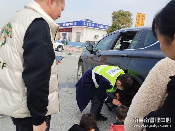2月18日,一辆黑色小轿车在南昌南管理中心南昌南收费站广场爆胎,当班收费员秒变“维修工,帮助他们顺利回家。