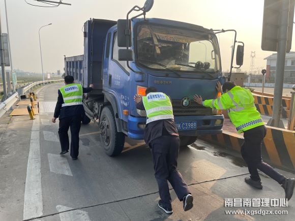 近日,一辆蓝色货车从南昌南管理中心新干北站上高速时,因车辆突发故障停留在入口收费车道上,该站工作人员施以援手,助其脱困。
