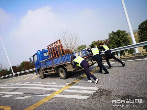 近日,一辆货车在南昌南管理中心丰城东站下高速匝道口抛锚,工作人员迅速出动,及时帮忙化解了险情。