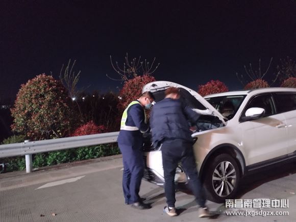近日,一辆车牌为粤WJXXXX的白色小车因车辆故障停在南昌南收费站出口道安全岛处,收费员帮助司乘维修车辆。