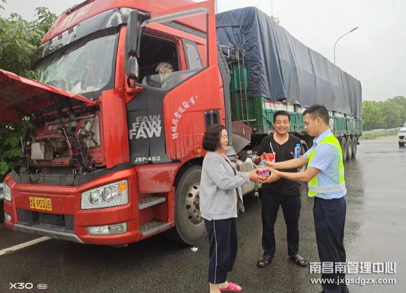 6月23日下午一时,一辆为货6的半挂车缓缓驶入南昌南管理中心双金收费站出口车道,只见车头已被撞的面目全非,引擎盖张着大嘴巴,前挡风玻璃都撞得四分五裂,
