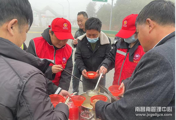 当天清早,进贤收费站入口滞留的车辆排起“长龙”,许多车辆在等候上高速。收费站工作人员积极配合交警维持广场秩序,做好相关的解释工作,进贤收费站“高速映山红”成员为司乘人员派发早餐、泡面、提供开水,并引导有需要的司乘人员去“便民服务室”休息,有效舒缓了司乘人员的急躁情绪。
