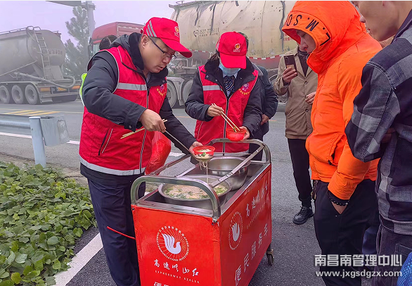 早上8时,入口滞留的车队越来越长,司乘人员由开始的耐心等待变得越来越着急。考虑到司乘人员从凌晨就开始等待,早已饥肠辘辘。该站工作人员立即启动应急预案,一方面做好解释工作,耐心为司乘人员提供路况咨询、便民充电、开水等服务,一方面为滞留司乘人员准备好了粥、面条等食物。