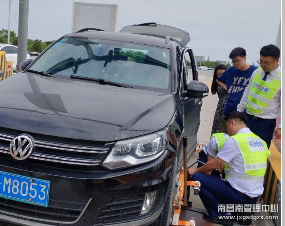 近日,一辆黑色SUV由于故障停在南昌南管理中心南昌南收费站109车道,值班站长了解这一情况后迅速组织人员使用挪车神器解决了难题。