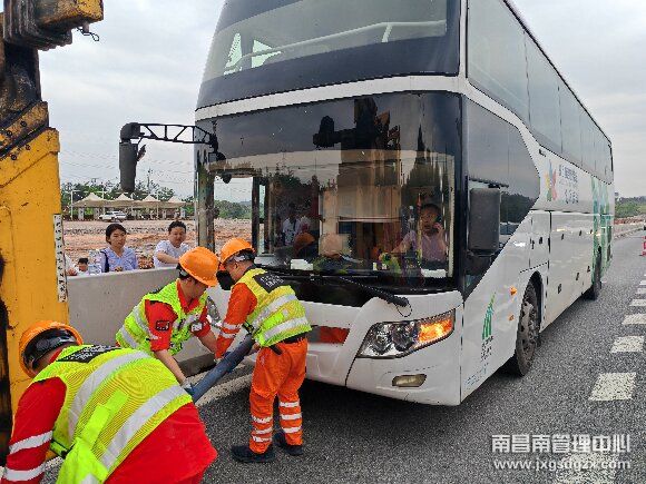 5月4日16时15分,沪昆高速梨温段K545上海方向一辆大巴发生故障无法正常行驶,车上载有47名旅客,急需帮助。南昌南车辆救援大队杨梅岭中队接到报警电话后立即组织人员以及转运车辆赶赴现场救援。