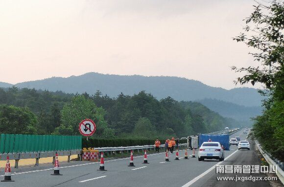 5月5日傍晚,南昌南管理中心东乡养护所洛市养护站养护人员巡查至南韶高速昌宁北段K76+200往南昌方向时,发现一辆货车侧翻事故,车辆侧卧在超车道及行车道。