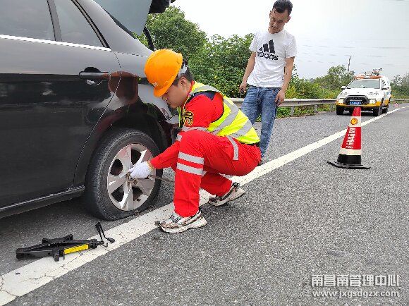 到达现场在车辆后方做好安全围蔽后,救援人员立即检查事故车辆故障情况,得知是因为行驶过程中发生爆胎,而随车也没有更换轮胎的工具,司机李师傅便拨打了救援电话。在了解情况后,救援人员免费帮助李师傅更换轮胎,并检查车况,排除其他故障。随后用预警车安全护送小车行至就近高速出口。