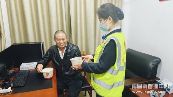 11月17日晚上19时左右,南昌南管理中心丽村收费站当班班长在巡查车道时,发现收费站门口有一人在寒风中焦急等待,便立即将其邀请到门卫室休息。
