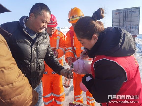 雪情就是命令,服务温暖人心。在接到通知后,该所立即启动应急预案,由所辖最近的罗湖收费站、东乡西收费站和罗湖车辆救援中队组织人员近15余人前往救援点。7时30分左右,志愿者们克服主线结冰阻碍,冒着严寒,分工协作,他们化身暖心“服务员”为司乘发放泡面、面包、加开水,化身心理“疏导员”安抚司乘急躁情绪,劝导他们耐心等候,化身除雪“铲冰员”,帮助司机铲除车辆轱辘下的冰块,防止车辆启动打滑,用热水浇大货车冻住的阀门……他们的暖心举动获得司乘人员的连连称赞和道谢。