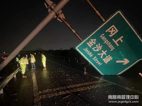 近日,江西气象台接连发布大风橙色预警信号,受强雷电、短时强降水、冰雹等强对流天气影响,南昌连接线往南昌方向下冈上收费站匝道出口信息指示牌被大风刮倒,影响道路通行,南昌南管理中心洛市养护站值班人员第一时间赶往现场进行紧急处置。
